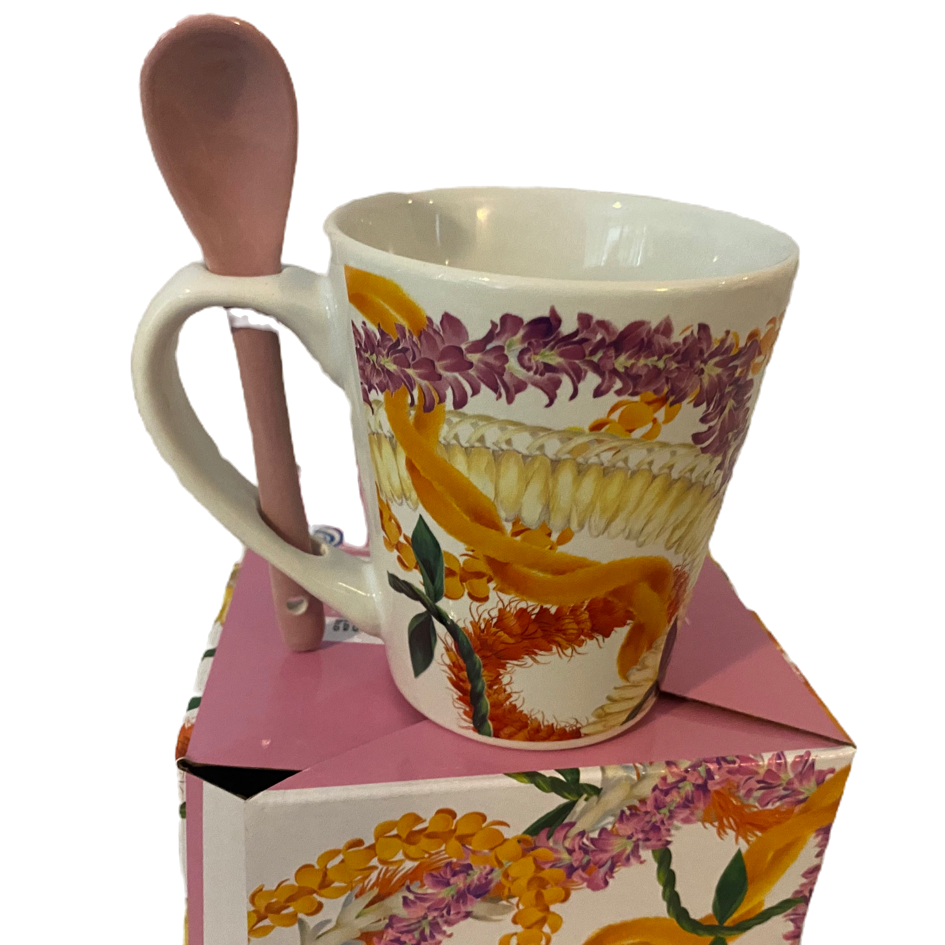 Start your morning with a touch of aloha! This beautiful floral lei mug comes with a convenient spoon, perfect for coffee or tea lovers.